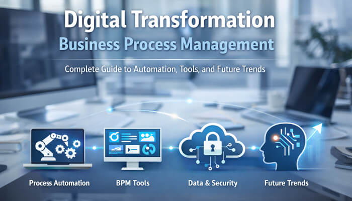 This guide explains digital transformation business process management in depth, including its technologies, lifecycle framework, implementation strategy, tools, real-world examples, and future trends.