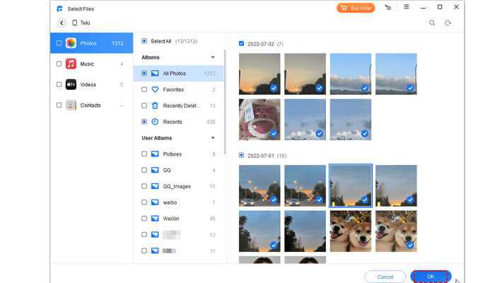 Step 3. Tap the Photos icon> Click the blue folder icon> Then you can preview and select the photos you would like to transfer to PC. If you want to move all photos to PC at once, check Select All icon, which can help you perform it quickly. >Then tap OK.