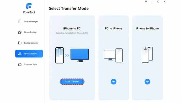 Step 2. Navigate to Phone Transfer> Move mouse to iPhone to PC> Click Start Transfer button to continue.