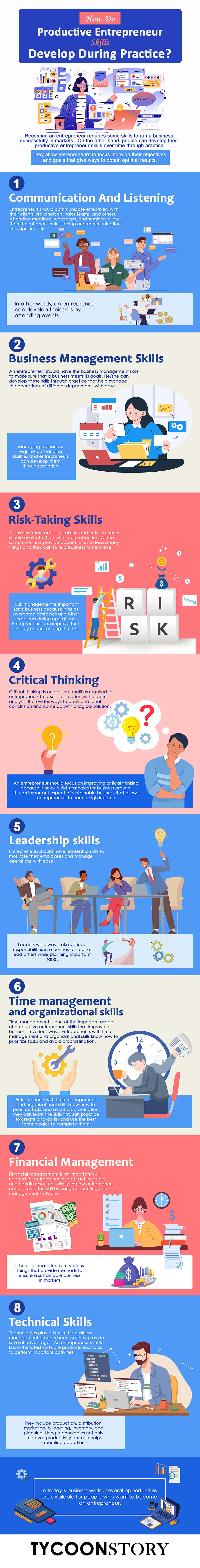 An entrepreneur should have the business management skills to make sure that a business meets its goals. He/she can develop these skills through practice that helps manage the operations of different departments with ease. Managing a business requires outstanding abilities and entrepreneurs can develop them through practice.