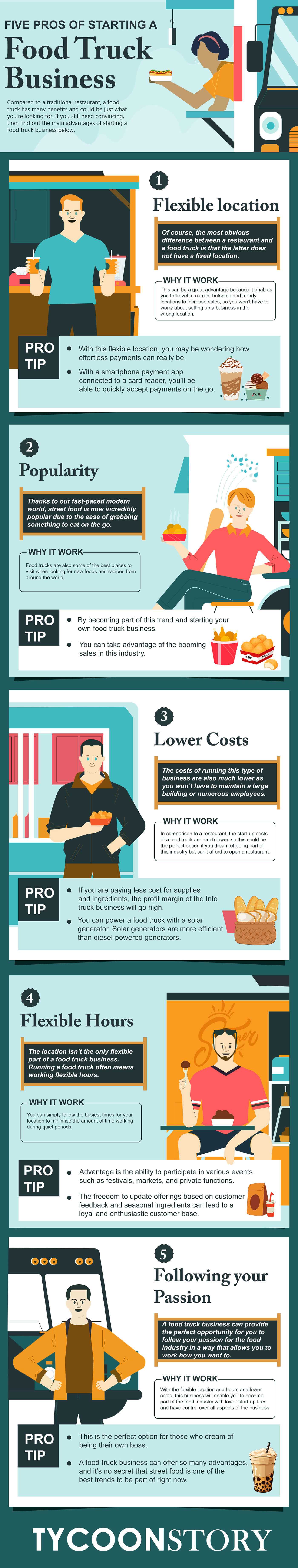 A food truck business can provide the perfect opportunity for you to follow your passion for the food industry in a way that allows you to work how you want to. With the flexible location and hours and lower costs, this business will enable you to become part of the food industry with lower start-up fees and have control over all aspects of the business. This is the perfect option for those who dream of being their boss.