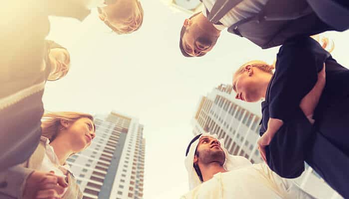 Group of professional real estate brokers in dubai discussing a business deal outdoors with modern skyscrapers in the background.
