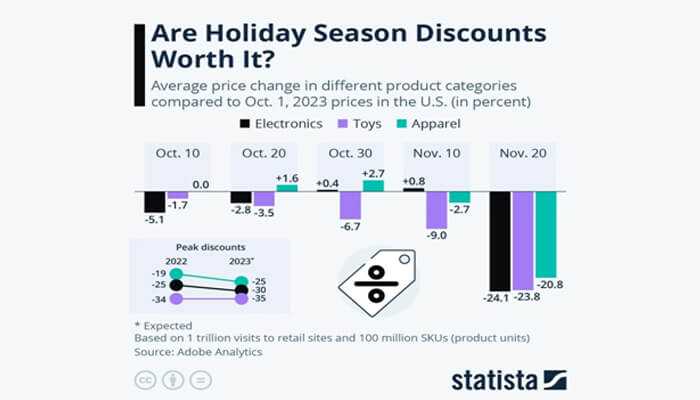 The chart below showcases the average price change in various product categories compared to their prices on October 1, 2023, in the U.S. This data reflects how Black Friday impacts not just the stock market but also consumer goods prices across different sectors.