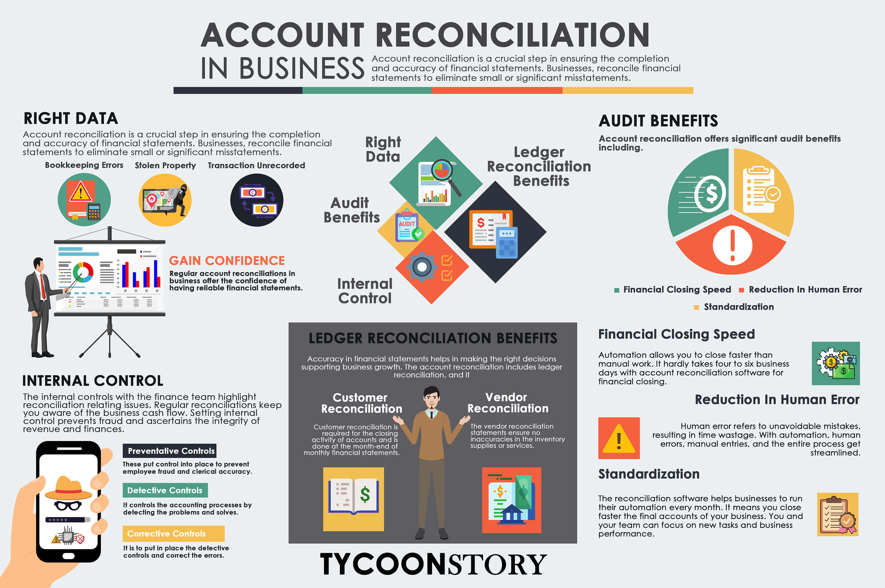 The internal controls with the finance team highlight reconciliation relating issues. Regular reconciliations keep you aware of the business cash flow. It helps in identifying clerical errors, fraud, and other hiccups that may affect the business closing process. Setting internal control prevents fraud and ascertains the integrity of revenue and finances. The internal controls include: