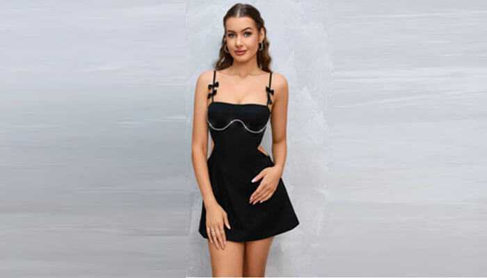 A dress with rhinestones stylishly calls for fun. The side cutouts and thin shoulder straps make the dress a flirty stunner. You can wear the dress for birthdays and celebratory parties at a summer picnic location. Or, you can wear it for a more upscale outdoor event or romantic dates in summer.